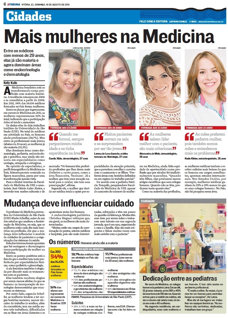 No dia 18 de agosto, a endocrinopediatra Dra Nadia Kleine participou de reportagem do jornal A Tribuna sobre o aumento das mulheres na medicina.