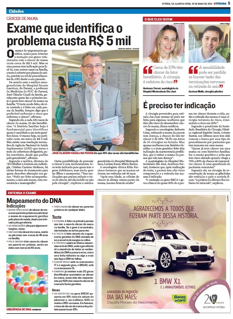 No Dia 15 de Maio na Coluna Cidade do Jornal A Tribuna o Cirurgião Plástico Gustavo Mello deu sua opinião sobre a retirada das mamas pela atriz Angelina Jolie após a realização de um mapeamento genético para Câncer de Mama. Leia: