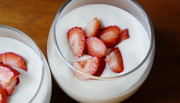 No momento de servir, desenforme a mousse e decore com a calda de morangos.