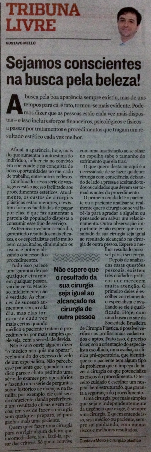 Sejamos Conscientes na busca pela Beleza: DR GUSTAVO MELLO Tribuna Livre